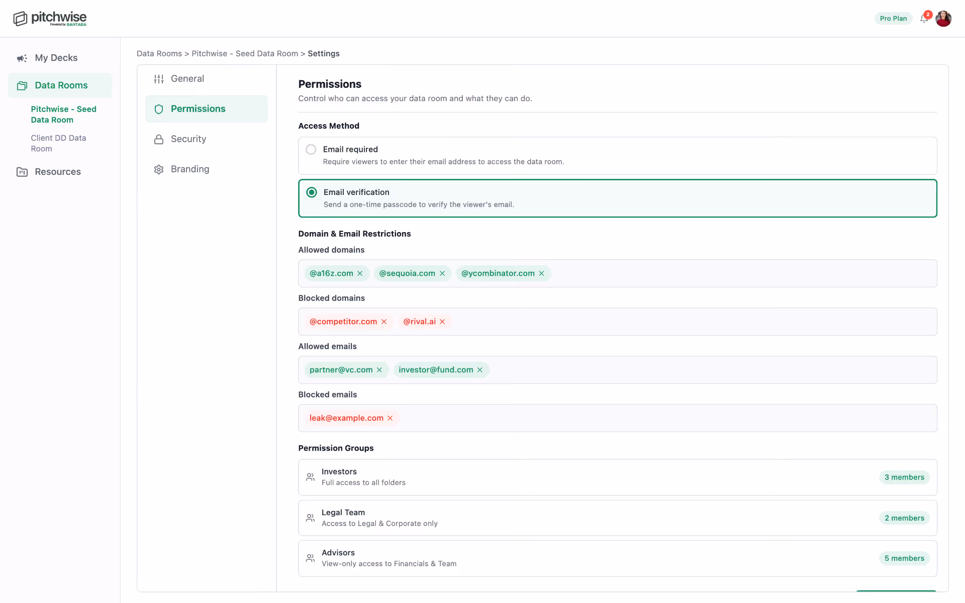 Set access by email, domain, or permission group. Verify viewers with one-time passcodes. Block competitors. Give legal one view, investors another — all from a single room.